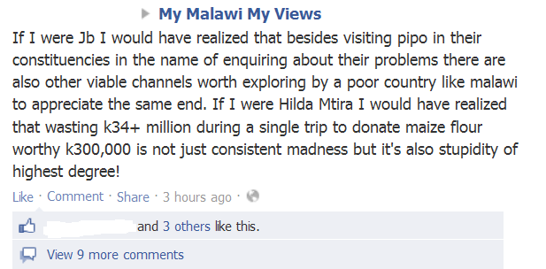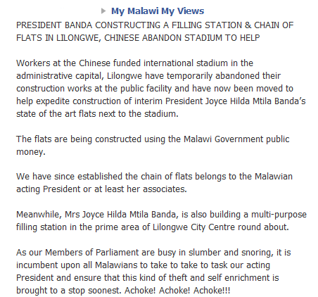My first problem with this is where did this guy get all this information from? He doesn’t say so, and that in itself is problematic, if not suspect. Further, who is he, a member of the Anti-corruption bureau? A forensic investigator? Or a concerned citizen? Whoever he is, such news stories are many and commonplace, they are the order of the day in Malawi. Days before, the same person posted a story alleging that the president was constructing a filling station and blocks of flats in Lilongwe: