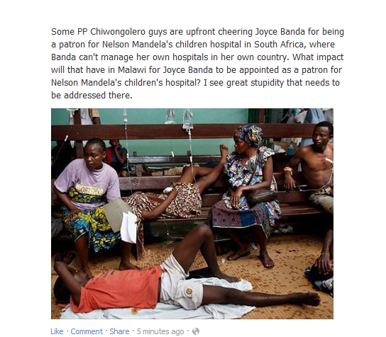 This is in response to a news update that appeared on president Banda’s Facebook page that the president had been appointed as Patron of the Nelson Mandela Children’s hospital Trust :