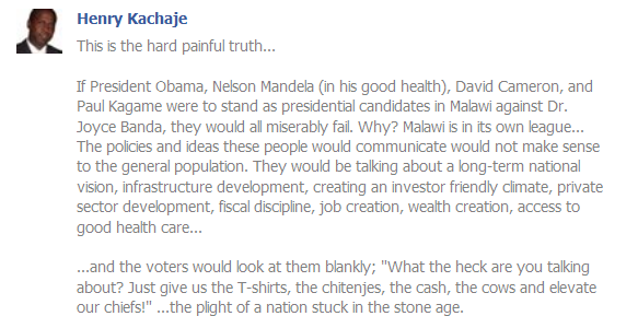 Below are some of the views that I have recently encountered, which minimally presents the sentiments within some quarters in Malawi. Whether these views represent a majority is doubtful. Whether they are genuine (as opposed to parody) is open to question…