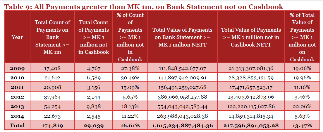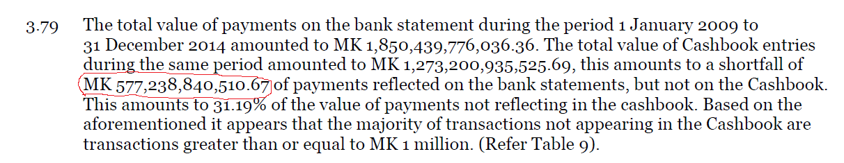 Last week, the leaked PwC ‘audit’ report (titled ‘Reconstruction of the Malawian Government Cashbook for purposes of further investigation’) which some people (including the Legal Affairs chair Peter Chakhwatha) claim is just an outline or at most a data analysis, revealed that MK577 billion was unaccounted for from Malawi government accounts between 1st January 2009 and 31st December 2014:-
