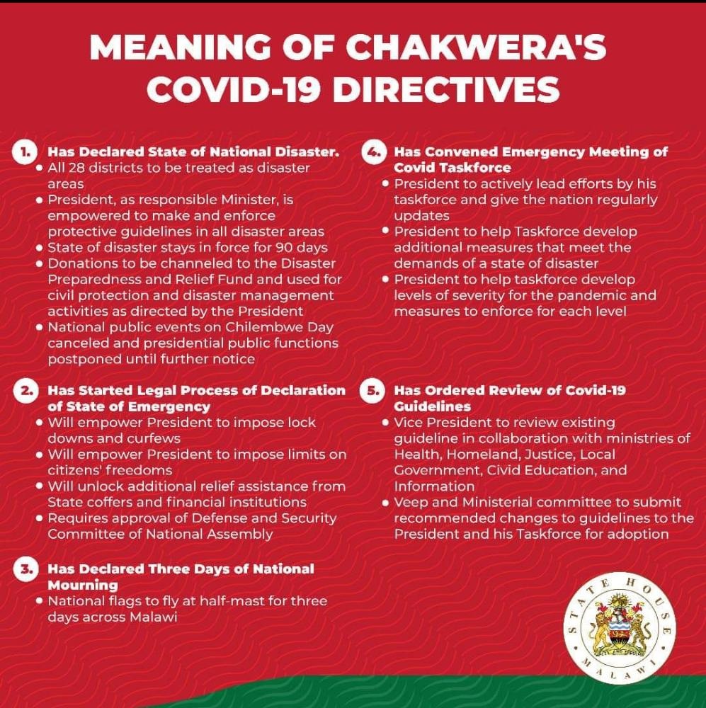 President Lazarus Chakwera, in his press conference last week declared a state of national disaster, and appealed to the international community, UN Agencies, NGOs and the private sector for more assistance and contributions to meet the challenge of the pandemic. Chakwera also called for an emergency meeting of the Presidential Taskforce on COVID-19 to explore additional measures to combat the pandemic. He also instructed several of his ministries (Health, Homeland Security, Education, Civic Education, Local Government, Justice and Information) to work together with the Vice President to review Malwi’s COVID-19 guidelines for curbing the spread of the virus, and recommend to the Taskforce any amendments to be made to those guidelines, and enforcement of those guidelines.