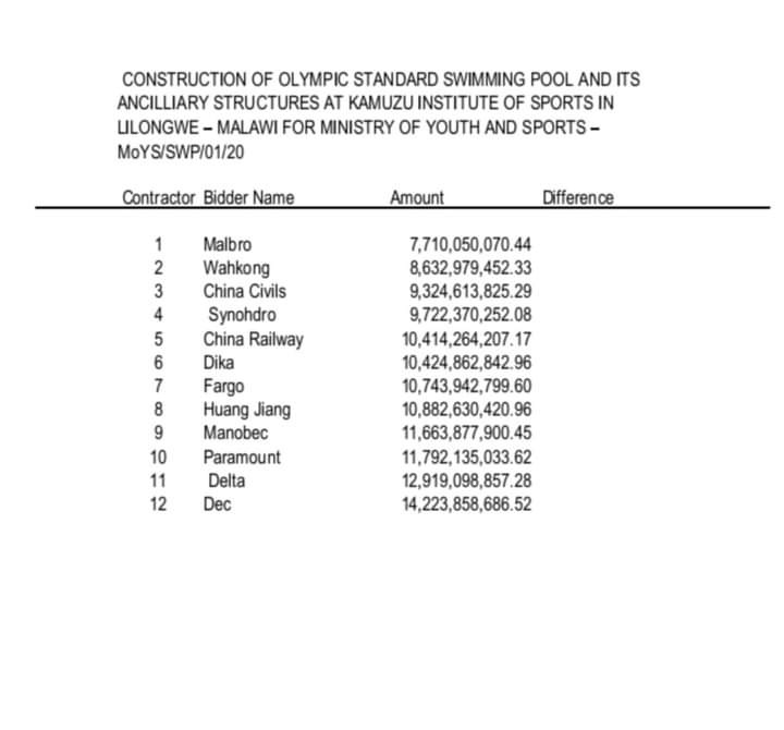 The above pictures were released by the Ministry of Youth and Sports in Malawi about a tender for a new Olympic standard swimming pool and other structures at Kamuzu Institute of Sports in Lilongwe. The tender shows that several companies have submitted a bid for the contract, with the cheapest coming in at K7.7 Billion (~ US$9.7 Million), but a Chinese company has been awarded the contract.