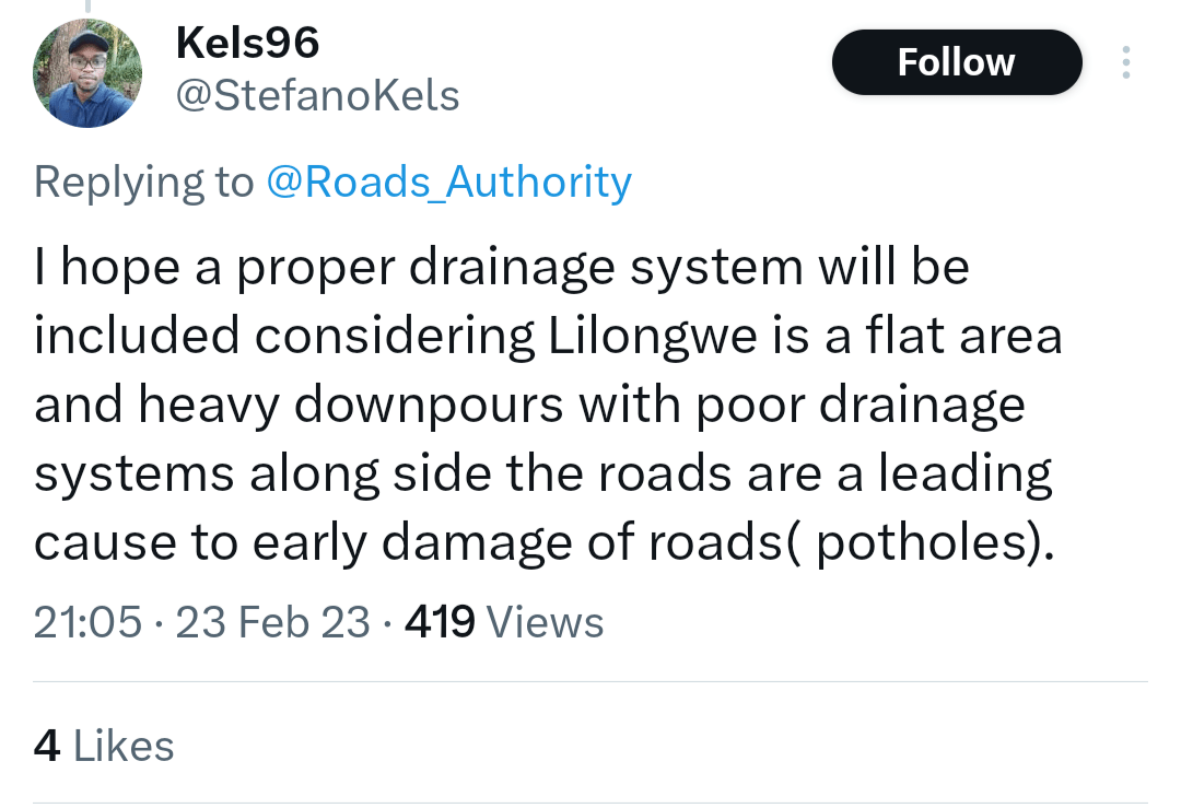There’s another persuasive argument on this matter. Roads should not be built just for motor vehicles, especially considering Malawi’s fledgling economy, whereby every few years we have faced a fuel ⛽ crisis. Going forward, we have to start seriously thinking about sustainability in road construction.