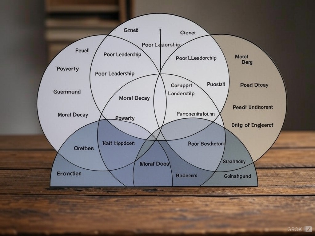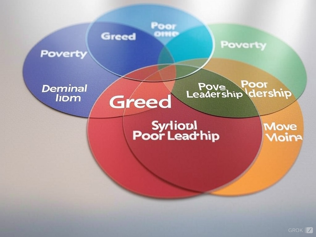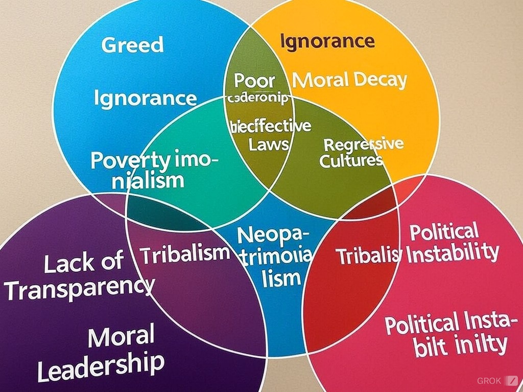 ‘Can you draw a venn diagram image of the causes of corruption in Africa, including Greed, Ignorance, Poverty, Neopatrimonialism,Poor Leadership, Moral Decay, Ineffective Laws, Regressive Cultures, and other reasons you can think about. No more than 15 factors‘