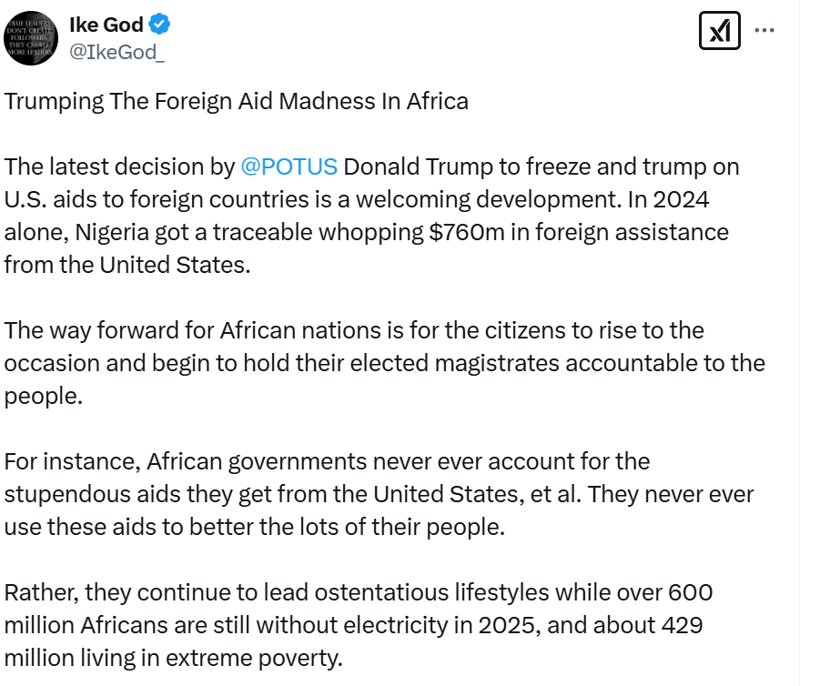 Some African analysts and commentators think the aid freeze is a good and necessary measure, which Africa needs, for African NGOs and governments to wean themselves off US assistance. However, the “price” that must be paid, for that transformation to take place (or whether it will go as smoothly as some advocates of this line of thought assume) remains to be seen.